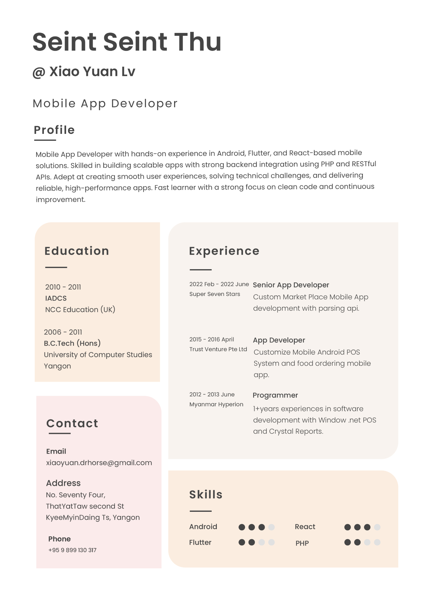 Hi! My Legal name is Seint Seint Thu. My Chinese name is Xiao Yuan, a passionate app developer. I love creating modern web and mobile applications, exploring new technologies, and bringing ideas to life.